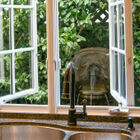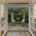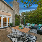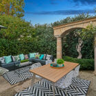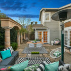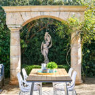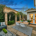 Reminiscent of a Tuscan estate, the back garden is an enchanting space surrounded by trellises of fragrant star jasmine. Hardscaped with a classical arch, Italian-style columns, and bubbling fountains, this is a tranquil spot for quiet contemplation or alfresco dining.