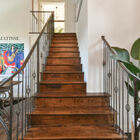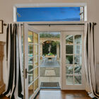 Beyond the travertine marble entryway, burnished hardwood floors glow beneath a vaulted ceiling, and corner windows fill the living area with natural light. A distinctive travertine marble fireplace graces one wall, and glass-paned French doors open onto a secluded back garden.