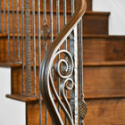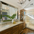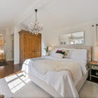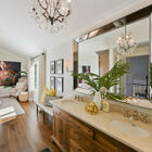 From the living area, a burnished hardwood staircase with custom wrought iron railing leads to the upper level. From the landing, wide French doors of multipaned glass open onto a stunning owner’s suite. An opulent retreat, the luxurious suite is adorned by a sparkling chandelier suspended from the vaulted ceiling. Windows on three sides fill the room with light and a custom, built-in French wardrobe provides abundant space for storage. The bedroom is open to a spacious split bath with a stone-topped dual vanity that glows beneath a second chandelier, and a matching etagere provides space for fluffy towels and sumptuous bath supplies. The spa-like walk-in shower of travertine marble with decorative tile accents includes a marble bench and frameless glass door.