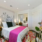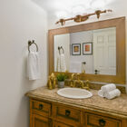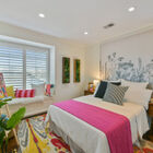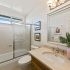 At the front of the home, the two additional bedrooms feature soft recessed lighting, plantation shutters, and large closets with mirrored doors. The adjacent shared bath features a shower over tub and has been updated with a travertine floor and stone-topped vanity for storage.