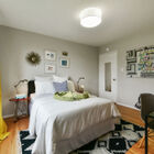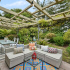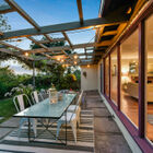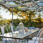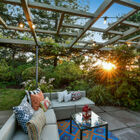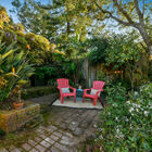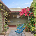 The expansive rear patio is exquisitely framed by a wide openwork arbor that allows light through and into the common areas. The garden brims with greenery and flowers, including a Meyer lemon tree, wisteria vines, palms, and other plants. Through a gate to your right and down a few steps, a second, lower-level patio area completes the idyllic picture.
