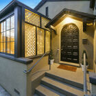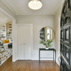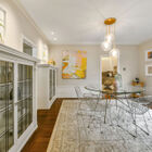 The carved wood front door opens onto a generous entryway that beckons with gleaming hardwood floors, wainscotting, crown molding, and vintage light fixture.