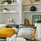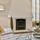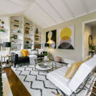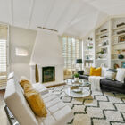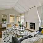 The spacious, light-filled living room features vaulted beamed ceiling and large windows flanking a brick fireplace. Lovely built-in shelves and cabinetry grace one wall.
