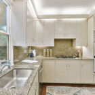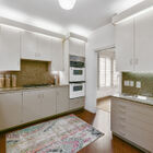 The graceful formal dining room features elegant wainscotting and original built-in cabinetry, and corner windows catch the light. The dining room opens onto the bright, updated kitchen, which features stone counters, gas cooktop, wall double oven, pantry, and ample cabinets for storage.
