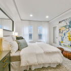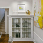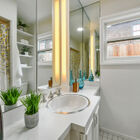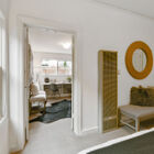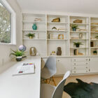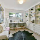 The three bedrooms connect to one another through louvered doors. The largest of the three boasts hardwood floors and oversized multi-paned windows overlooking the sunny backyard. The connecting second bedroom has multi-paned windows facing the side yard and a deep closet with louvered doors. The third bedroom has been configured as an office with a built-in desk and shelves.