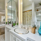 The three bedrooms share a full bath with tile shower over tub, solid surface vanity, tile floor, shuttered double door entry