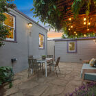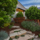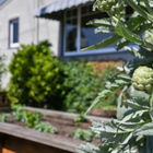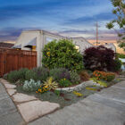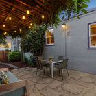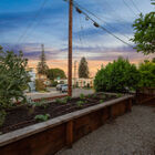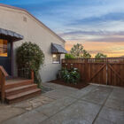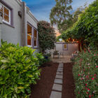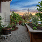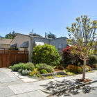 Ideal for entertaining, al fresco dining, or quiet relaxation after a hectic day, the enchanting back garden features a flagstone patio lined with blooming lavender, a redwood pergola with a fragrant canopy of wisteria, orange hot lava abutilon tree, and a variety of flowering bushes and shrubs. A path of stepping stones leads through a gate into the side garden with espalier apple, Mandarin orange, lime and lemon trees, an herb garden, and a large raised bed planted with artichokes and other vegetables.