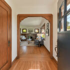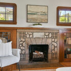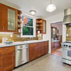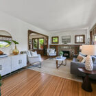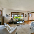 The front garden is an explosion of color with a red Japanese maple tree, African and Cape daisies, blooming lavender, a lemon tree studded with yellow fruit, and a black eyed Susan vine climbing one wall. Inside, a gumwood-trimmed window fills the expansive living room with natural light, and an updated stone fireplace is flanked by gumwood built-in cabinets with leaded glass doors.