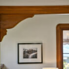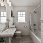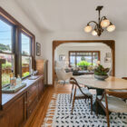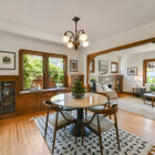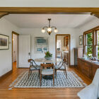 Through a wide doorway, the formal dining room is lit by a vintage-style chandelier and a pair of double-hung windows on one wall. A built-in hutch of original gumwood includes drawers and cabinets flanked by display shelves with leaded glass doors. Off the dining room is a short hallway, where two sunny bedrooms share a large bath with basketweave tile floor, tile wainscoting, shower over tub with subway tile walls, and pedestal sink.