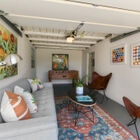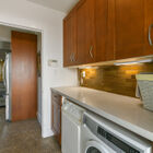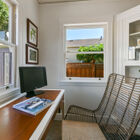 Off the kitchen, the sun-washed breakfast nook (or possible office?) features modern cabinets for storage and a vintage corner hutch for display. The adjacent laundry room features an Electrolux washer and Miele dryer beneath a stone counter with Heath backsplash and modern cabinets, and a convenient side door provides access to a gated patio and detached garage.
