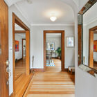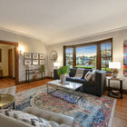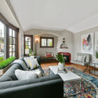The spacious entryway opens onto the inviting living room where a wide bay window overlooks the quiet street. The elegant coved ceiling, crown molding, and variegated hardwood floors with mahogany inlay create a gracious aesthetic, and the period corner fireplace provides a warm glow on winter evenings.