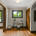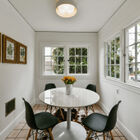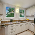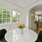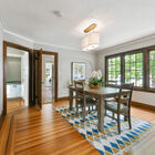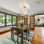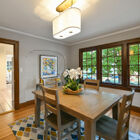 From the living room, beautiful wood-trimmed multi-pane French doors open onto the formal dining room. Natural light pours in through a wall of multi-pane windows, giving the hardwood floors a warm glow. Large enough for celebration dinners with extended family and friends, this is a room gracious enough for intimate candle-lit dinners as well.