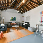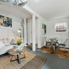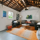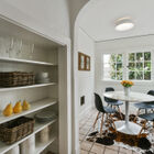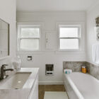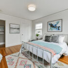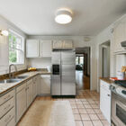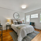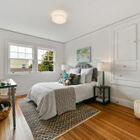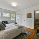 Up a short flight of stairs are two additional light-filled bedrooms, one with a walk-in closet, the other with vintage built-in drawers and shelves. The hallway includes a second linen closet for bedding and a quirky vintage laundry chute ending in the basement.