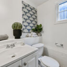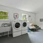 From the main level, a second short staircase leads to the high-ceilinged finished basement with a half bath and laundry area housing a washer and dryer as well as a double utility sink. The remaining bonus space could easily be configured as a rumpus room or office.