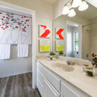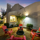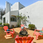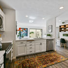 Upstairs, the spacious primary suite is lit by wide multi pane windows and includes a large walk-in closet. The adjoining split bath features a shower over tub and wide vanity with dual sinks. The secondary bedroom features a large closet and sliding glass doors that open onto an expansive deck - perfect for relaxing under the stars. The adjacent split bath with shower over tub and sunny skylight is shared with the third bedroom on this level.