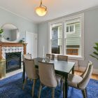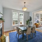Pocket doors open onto the sun-washed formal dining room whose period features include double-hung windows, a closet with built-in shelves with a pass-through window, traditional wood fireplace with decorative tile face, and a vintage-style pendant light. Across the hall is a butler’s pantry with shelves and drawers - a feature from another era.