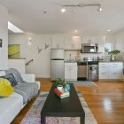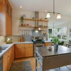 The spacious chef’s kitchen has been stylishly remodeled with Corian countertops and backsplash, modern maple cabinets that reach to the high ceiling, and a mobile island with additional space for meal prep. The experienced home chef will appreciate the gas range, Bosch dishwasher, and huge pantry.
