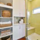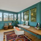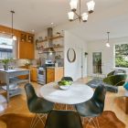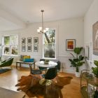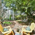 The kitchen is open to a cheerful dining area for informal meals, and to an open sitting room lined with windows and a glass door leading to the enchanting backyard. The adjacent laundry area houses a Miele front-loading washer and dryer, stone counter for folding clothes, and shelves and cabinets for storage. A split bath includes a tiled walk-in shower with travertine bench seating.