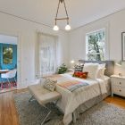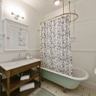 The three bedrooms share a large bath with a delightful shower over clawfoot tub and a freestanding vanity with vintage-style medicine chest.