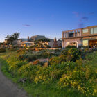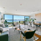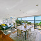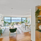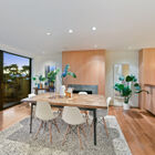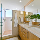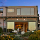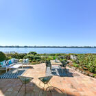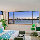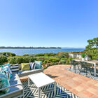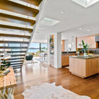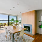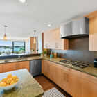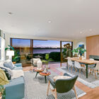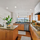 Behind the front gate, a tranquil, lushly landscaped courtyard entry features vertical mirrors which expand the open feel and reflect the greenery in multiple directions. The front door opens to reveal a stunning open space with gleaming hardwood floors and a floor-to-ceiling wall of glass that immediately draws the eye to an arresting view of the bay. The great room features a recessed granite-framed fireplace and a half wall of custom cabinets topped by a teak countertop dividing the common area from the kitchen.