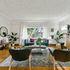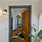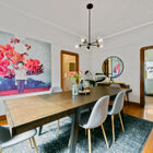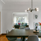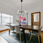 As you move further, you enter a formal dining space conveniently connected to the kitchen. Accented by a modern light fixture, the coved ceilings, original wood trim, and glass-paneled door keep the space private from the rest of the living quarters.