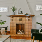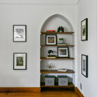 The living room expands before you with high, coved ceilings, a large picture window, and tiled fireplace flanked by stained glass windows. In a corner niche, the arched built-in bookcase adds to the overall character of the room.