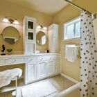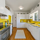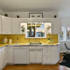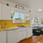 The moment you set foot onto the front walkway of 3000 San Jose, you notice the stunning arched porch that frames a beautiful, solid wood door. Upon entry, you are met with another arched doorway that leads you into the art deco-inspired eat-in kitchen. The breakfast nook is neatly situated in a bay window, and new hardwood floors and cheerful yellow counters and backsplash complement a Verona 5-burner electric range with double ovens, surrounded by ample storage.