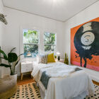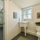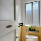 As you make your way up the split staircase, you enter the living area which boasts three bedrooms on one level and a shared bathroom. The rear two bedrooms have windows on two sides while the third boasts an oversized closet. The shared split bath includes a separate water closet with art deco tile and wainscoting. The main bathroom has ample storage, a shower over a vintage tub, and a two-station vanity.