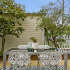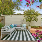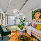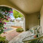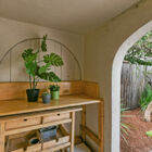 Walking through the side door, you immediately notice the brilliant pop of color that is mature bougainvillea complimenting the arched pass-through to the backyard. A potting station is tucked into the covered patio. Just beyond the double arches, you enter a fenced-in garden that enjoys mature fruit trees and areas for entertaining and gardening.