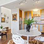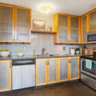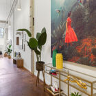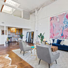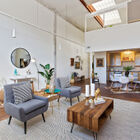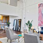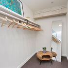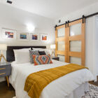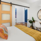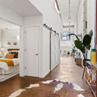 The spacious entryway includes three closets - one for coats, a walk-in closet for additional storage, and one whose louvered barn door conceals a stacking washer and dryer. Also on this level, a glass-paned barn door opens to reveal a room that, in the spirit of the live/work principle, could be configured as a bedroom, office, or studio.