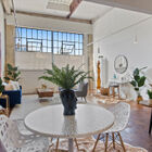 Portico Lofts, once a 1920’s plumbing showroom/warehouse, has been renovated to maintain the character of the original building while adding cheerful color and modern architectural touches including glass brick, skylight tubes, and vintage style sconces. An open common area features stone benches, trees, climbing bougainvillea, and planters filled with succulents.