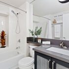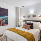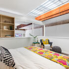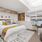 Up the staircase, multiple skylights create an open sun-washed ambiance on the mezzanine level with a walk-in closet and generous loft-style owner’s bedroom overlooking the living area below. The adjacent bath features a tiled walk-in shower with built-in seating. Beneath a large skylight, a stone-topped vanity provides storage.