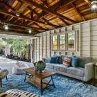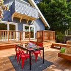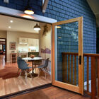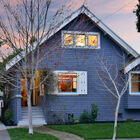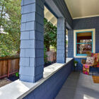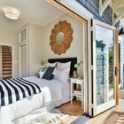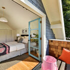 Another bedroom faces the backyard. The vaulted ceiling and French doors of multi-paned glass give a sense of the outdoors flowing in. The French doors open onto a shingled balcony large enough to sit with a snack and watch the sunset over the trees.