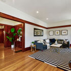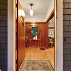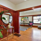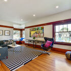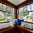 The plank front door opens onto a wide, high-ceilinged entryway paneled with glowing redwood and Douglas fir. The adjacent spacious living room is lit by oversized windows on three sides and features warm wood details such as picture rails, baseboards, and a built-in window seat with corner windows - an ideal place to snuggle up on a rainy day.