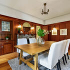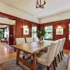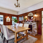 On the other side of the entryway, a pocket door opens onto the bright, formal dining room with windows on two sides. The traditional brick fireplace is flanked by original built-in cabinetry, and the chandelier was converted from the gas-powered lights of another era.