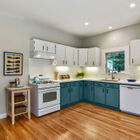 Through the dining room is the updated eat-in kitchen with stone counters, gas range, Bosch dishwasher, and ample cabinets. The breakfast room at one end has glass French doors that open onto the sunny backyard deck, conveniently placed for carrying hors d’oeuvres out to guests.