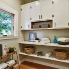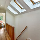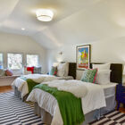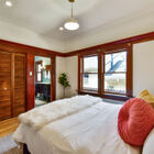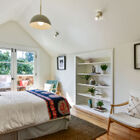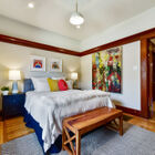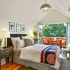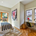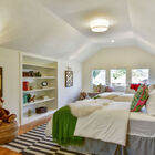 Upstairs, a spacious bedroom with a vaulted ceiling and large windows faces the street. Under the windows, a built-in floating bench offers an ideal perch for watching the world stroll by. Built-in shelves provide space for books or prized collectibles. For additional storage - or for use as a tiny playhouse - there is access into attic space under the eaves on either side of the room.