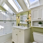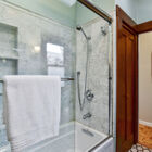 The two bedrooms share a large updated bath filled with sunshine streaming through a trio of skylights. Sparkling subway tile with decorative accents frames the shower over tub with glass doors, and ample storage is provided by a stone-topped vanity and built-in shelves.
