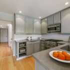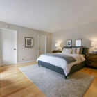 Also on the first level of this lovely home, there is an updated chef’s kitchen with stylish stainless steel appliances, new quartz countertops, and sleek cabinets that reach to the ceiling. Attached to the kitchen is a breakfast room that, like the living room, has views and sliding door access to the deck. Pass through the hallway from the kitchen and take in the powder room with marble floor, a spacious laundry room also with marble floor, and built-in wine refrigerator. From there, you enter the spacious owner’s suite, which includes an expansive walk-in closet and a bath with a step-in shower with built-in seating, a granite vanity, and access to the patio.