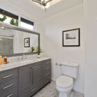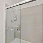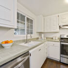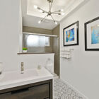 Two additional bedrooms share an updated bath with step-in tile shower with glass doors, recessed ceiling, and a solid surface vanity with drawers.