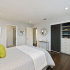 At the back of the home, the owner’s suite is lit by high windows and has a large closet with ample built-in shelving and drawers. Another set of built-in shelves provides additional storage. The updated en suite bath boasts honeycomb tile floors, a vanity with drawers and stone countertop, and a tile shower with glass doors.