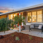 As you approach the home, drought-resistant landscaping adds beauty without excessive maintenance, and a shaded porch runs along the front of the house.