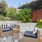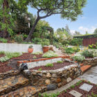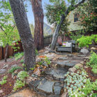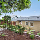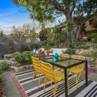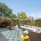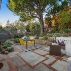 - Expansive private garden features multiple patios and sitting areas, plant beds, thornless blackberries, herbs, and trees (including plum, lemon, and a rare extra-tall stone pine)