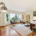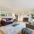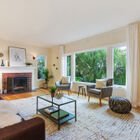 As you approach the front door past lush flowering plants and rustling trees, you will be gently pulled under the home’s irresistible spell. Once inside, you will find yourself in the bright and inviting vestibule, with the light-filled living room to your right and bedroom wing just ahead. A generously proportioned space whose dramatic picture windows gaze majestically over neighboring rooftops and the bay, the living room is at once elegant and comfortable. A graceful wood-burning fireplace and original hardwood floors frame this lovely space.