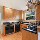 - Well-designed kitchen features under-counter lighting, countertop gas range with downdraft and wooden cutting-board cover, shallow yet capacious refrigerator that mimics the counters’ depth, and dual-compartment porcelain sink with windows overlooking the garden