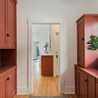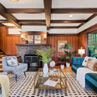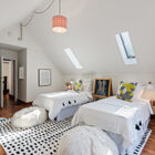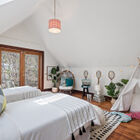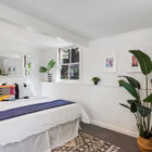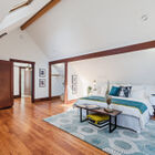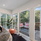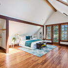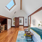 A wood-paneled staircase leads to an open landing, a bonus room/office, and two light-filled bedrooms. Beneath a vaulted ceiling, the primary bedroom is lit by a skylight and multipane glass windows overlooking the front garden. Large enough to include a separate sitting area, the room features a built-in entertainment center and multiple open concept closets. The secondary bedroom features a vaulted ceiling with two operable skylights, and glass doors partially shaded by the tall trees surrounding the back of the home. Multipane French doors open onto a bonus room surrounded by large windows that might serve as a home office, yoga studio, or sunroom.