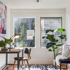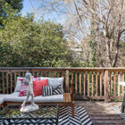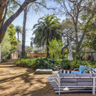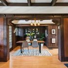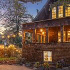 The enormous front garden enchants with lush greenery shaded by mature palm, redwood, and oak trees, and the wraparound front porch calls to mind summer parties for extended family and friends. Overlooking the expansive front garden, the porch is a peaceful spot for morning coffee or evening drinks, lulled by the music of Sausal Creek running behind the home.