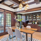 Inside, two series of sash windows typical of the architectural period fill the expansive living room with natural light. The coffered ceiling and distinctive brick fireplace lend charm and character to this gracious room. Through a wide doorway, the formal dining room features a gorgeous built-in china hutch with storage space for table linens and shelves with leaded glass doors for serving pieces. Multipane French doors open onto the porch, perfect for expanding a dinner party outdoors.