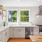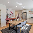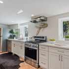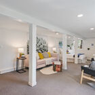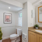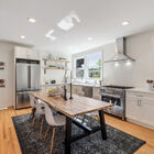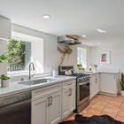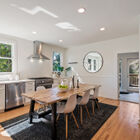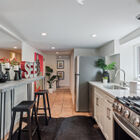 Downstairs, the finished basement has been converted to a spacious full-service studio apartment with recessed lighting and multiple sunny windows at the street level. The apartment includes an expansive bed and sitting area, modern eat-in kitchen with stone countertops and a gas range, a full modern bath, and laundry area. The private entrance leads to a covered patio beside the creek.