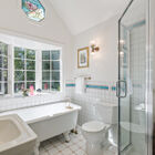 The two bedrooms share a large bath with a vaulted ceiling and decorative tile wainscoting and a walk-in shower. Embraced by a sunny bay window, a vintage clawfoot tub for relaxing, full-body soaks. The window includes a deep shelf large enough to hold the foams, bubbles, and salts you will need for sumptuous bathing.
